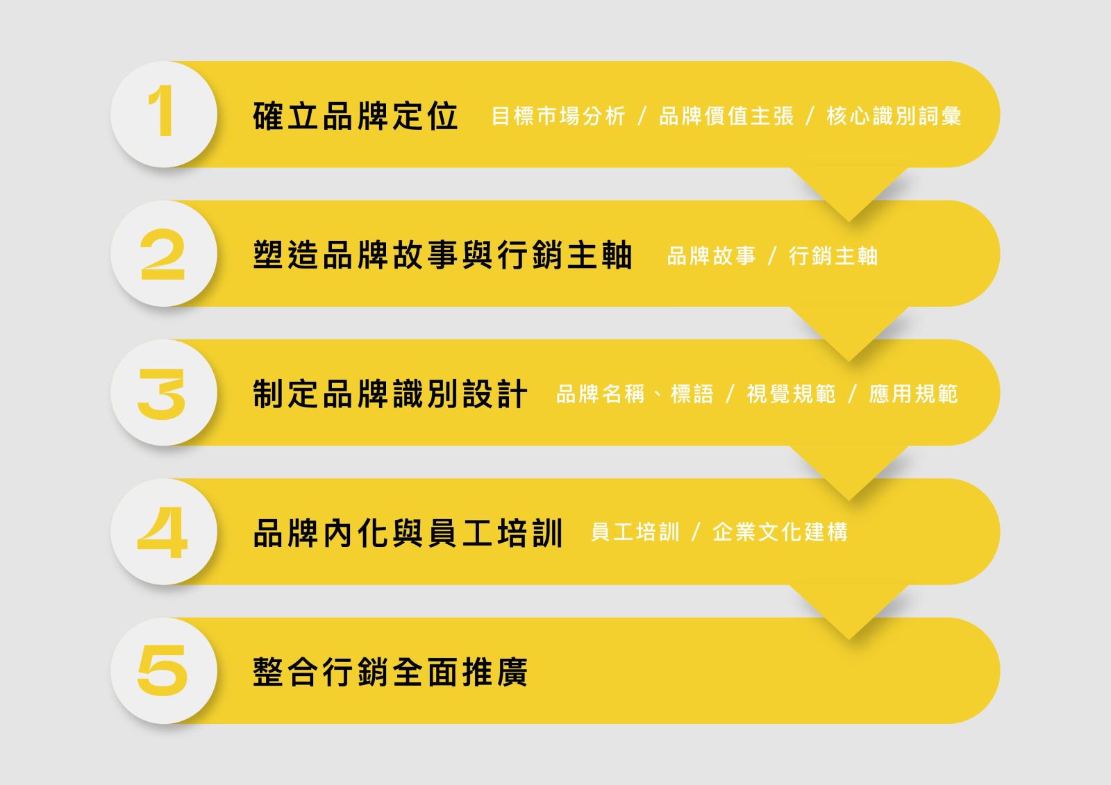 規劃品牌策略的過程,建議按照由內而外、循序漸進 的原則,以下提供一個常見的 5 步驟架構,協助企業逐步打造可長久運行的品牌體系。