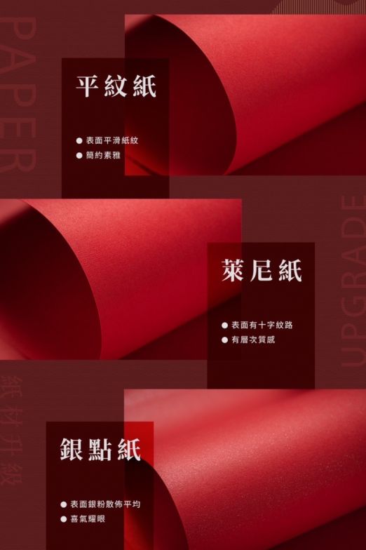 - 喜氣款:略帶細粉的銀點紙,特別適合婚禮紅包客製化