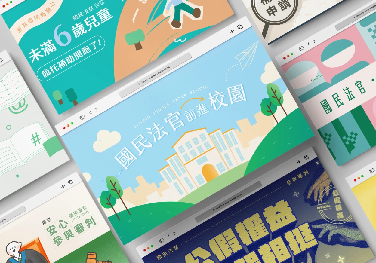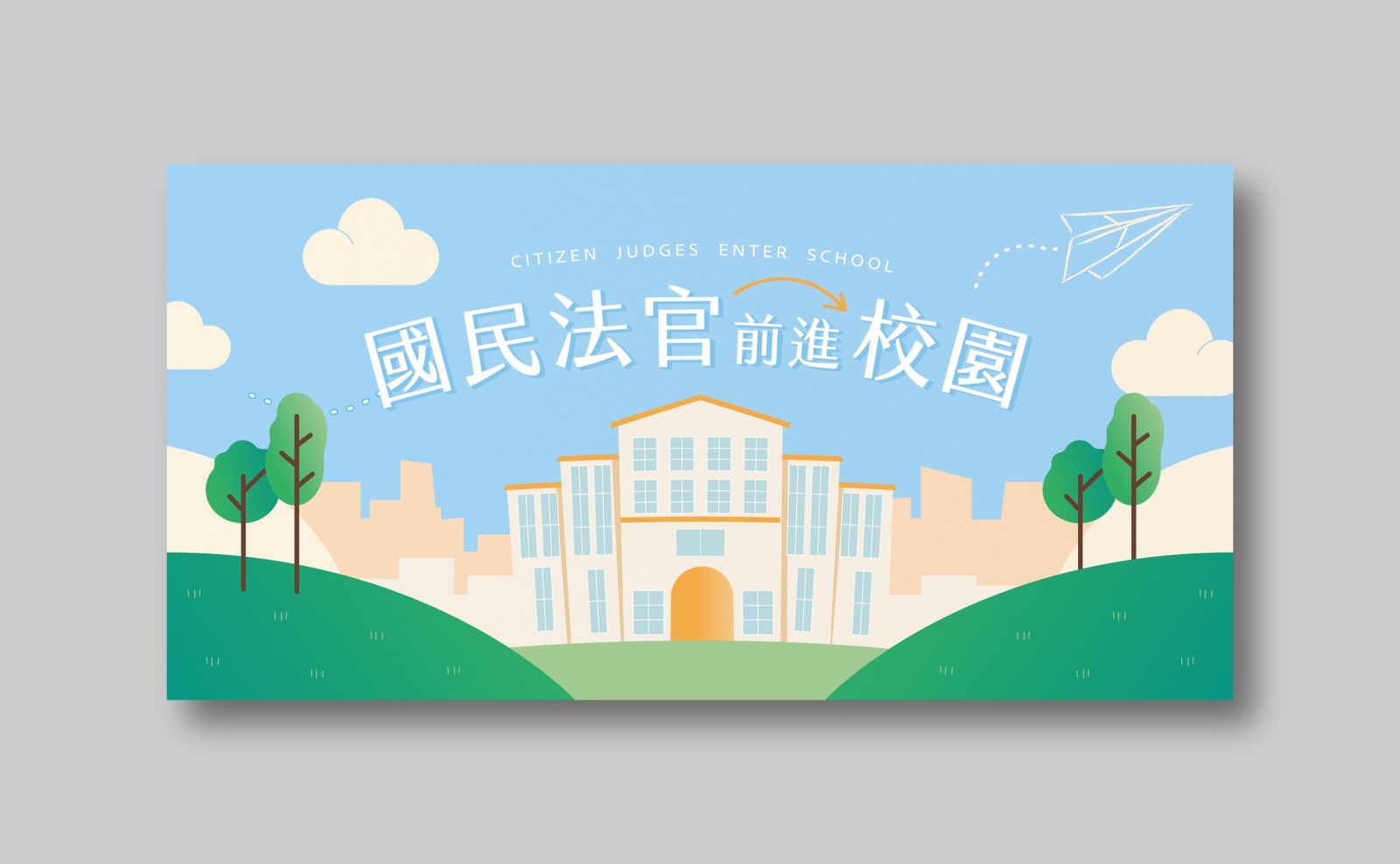 此設計風格將文案標題「國民法官前進校園」的前進兩字加入引導感,整體以活潑、簡約具有微動態視覺感的氣氛展現,利用遠觀的視角呈現國民法官正前往校園的意境。