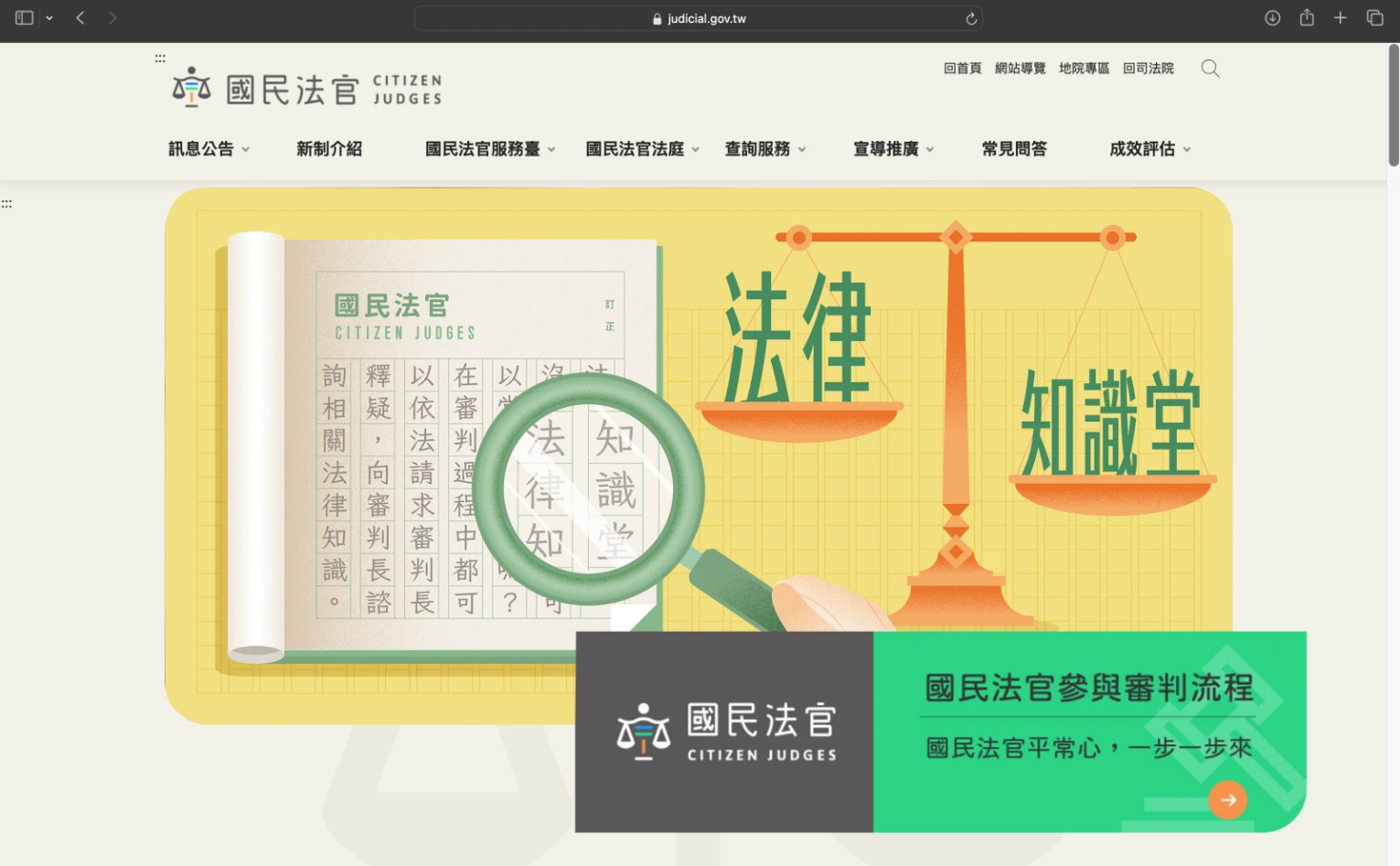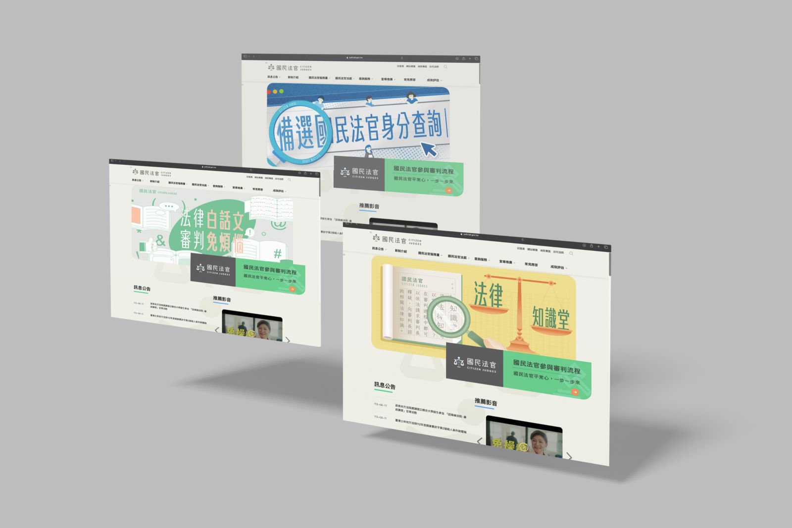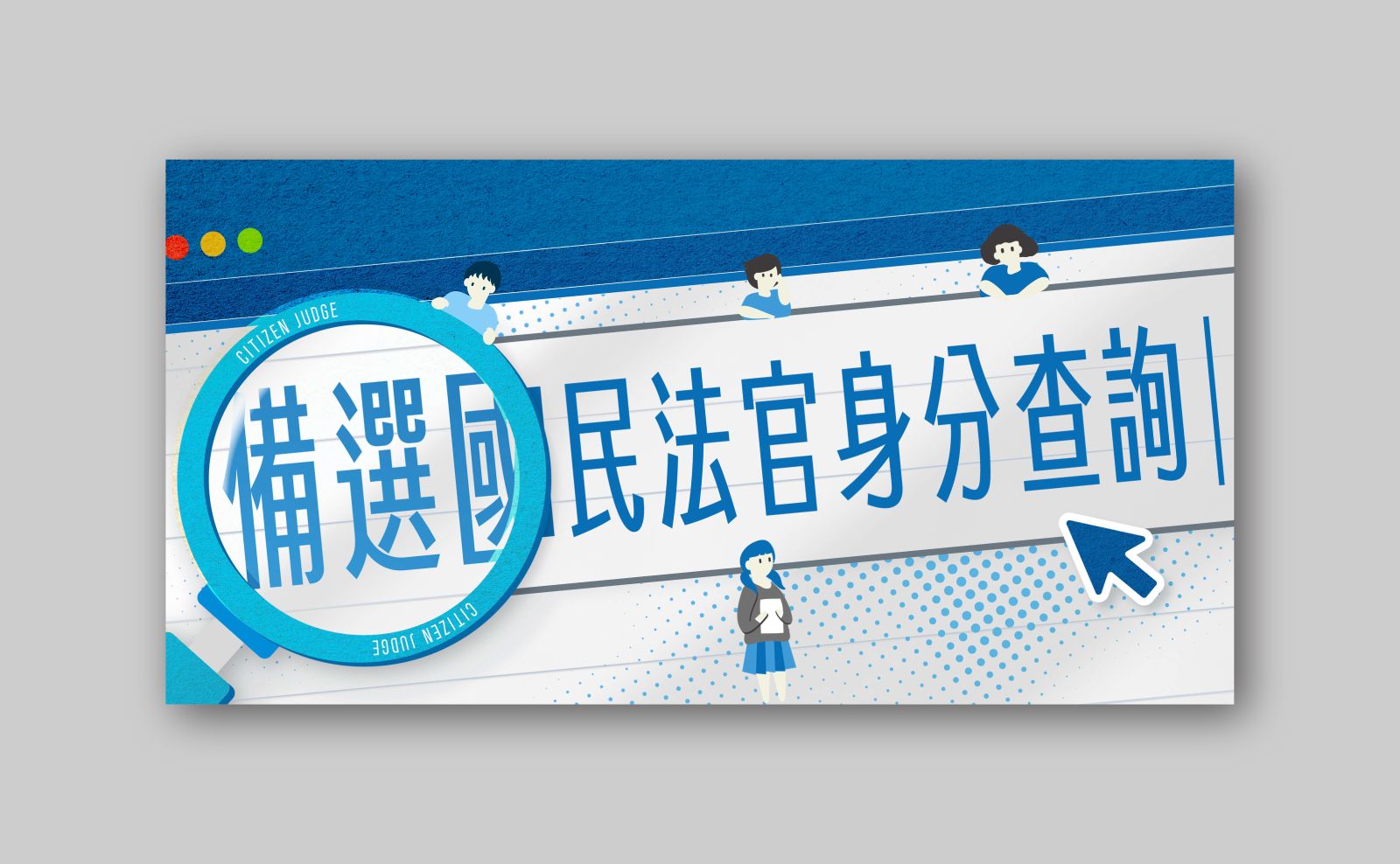 以『查詢』二字聯想到放大鏡與網頁搜尋,整體文字結合到輸入查詢的方塊與滑鼠,並將國民法官裡的小人融入,整體主視覺以藍色系為主,藍色感受有冷靜專業,並結合不同材質將藍色呈現出層次感。