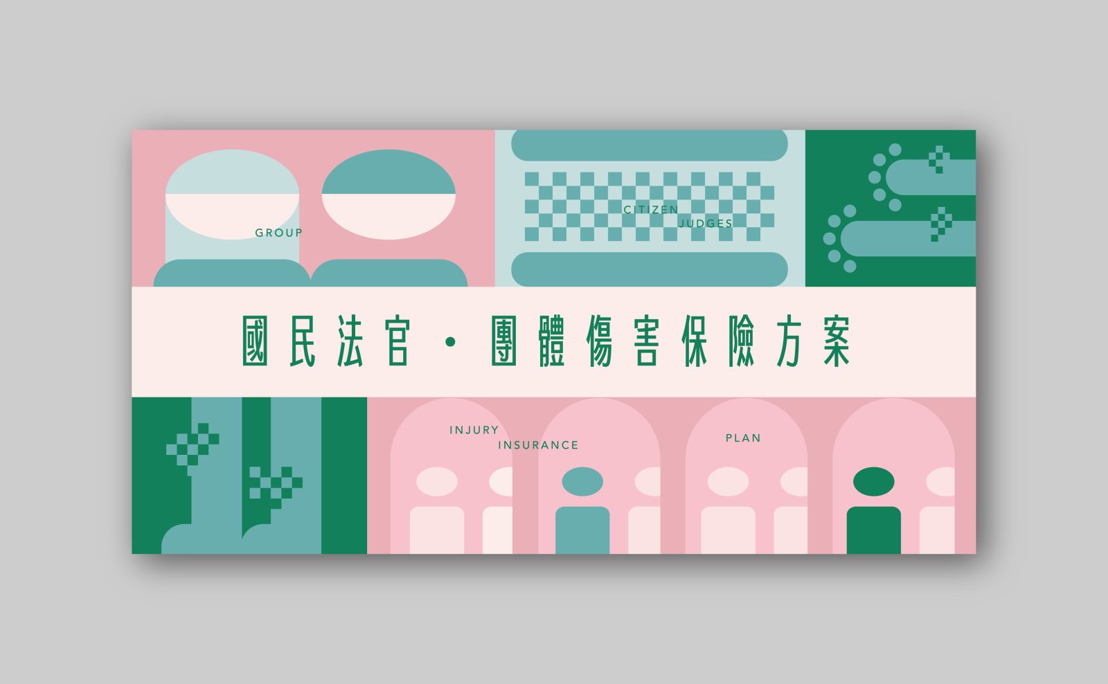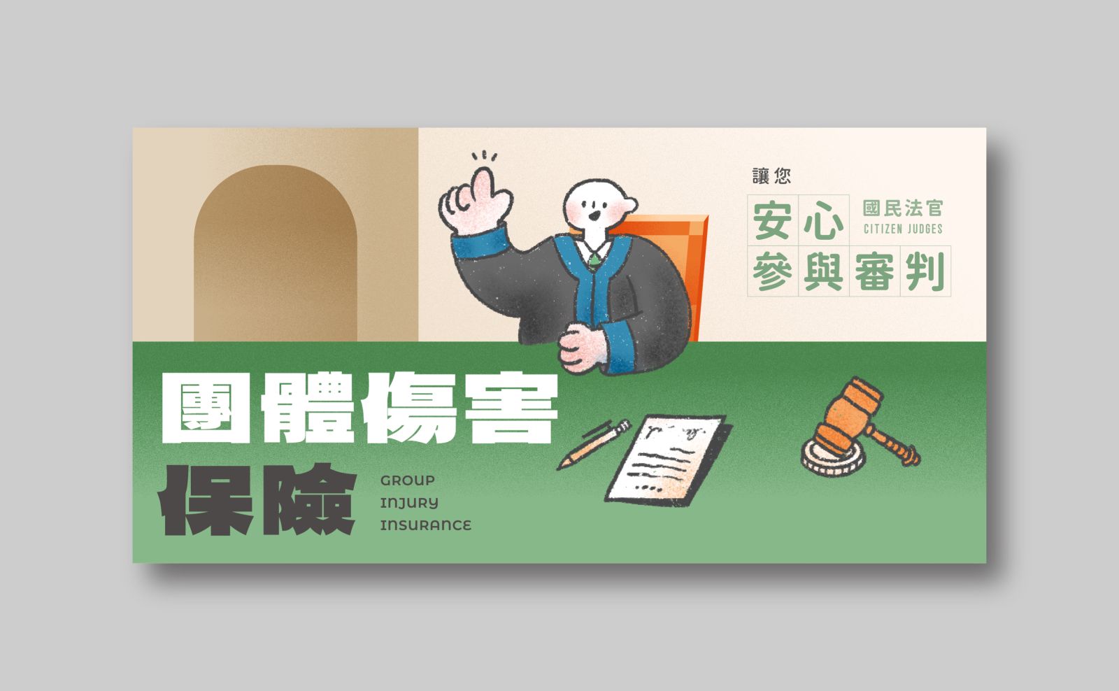 故事以親切的法官為國民法官們講解「國民法官團體傷害保險」。整體以綠色色塊將畫面一分為二,營造俐落簡約的視覺調性,而綠色色塊也成為桌面,並擺著法官常用的文件、筆、法槌等物品,為畫面增加趣味性與主題關聯性。