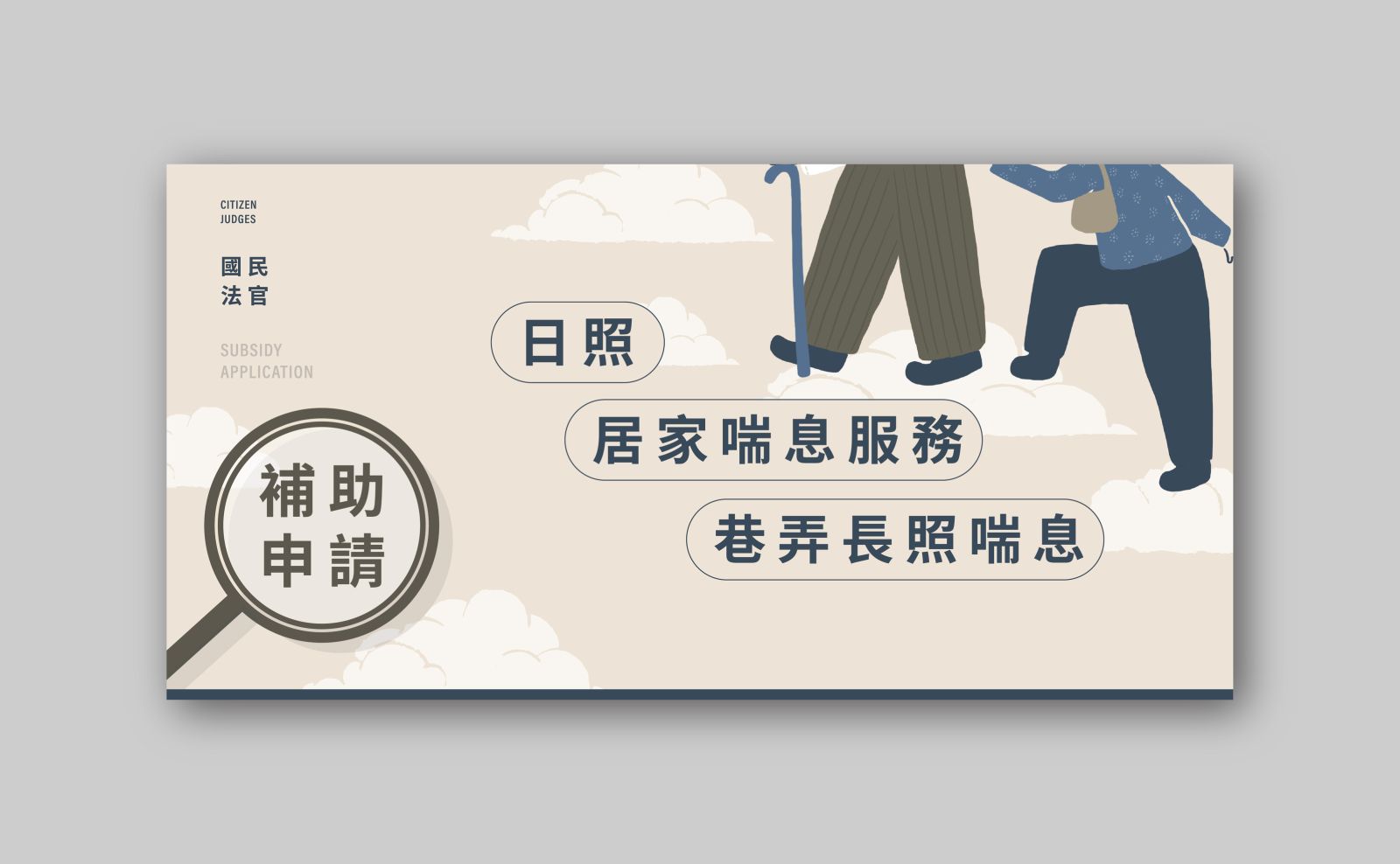 此款設計以走樓梯的方式,隱喻三項補助申請能夠降低人民的壓力,如同踩在雲上的輕鬆,老爺爺牽著老奶奶走,色系上以柔和低飽和度的顏色呈現。