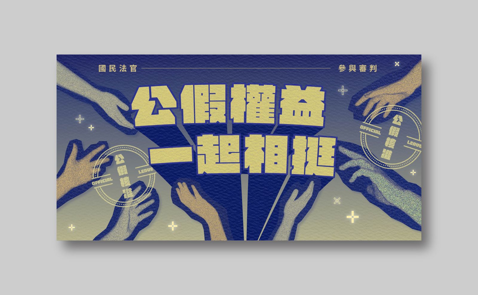 此設計發想於『相挺』的形象,初稿中希望呈現出支持此議題的感覺,圖中添加了許多實體的手,來表達出人人都可以挺胸而出來捍衛自己權益,並設計『公假核准』圖章,表現請假流程是道道程序。整體配色以藍黃對比色來重點強調。