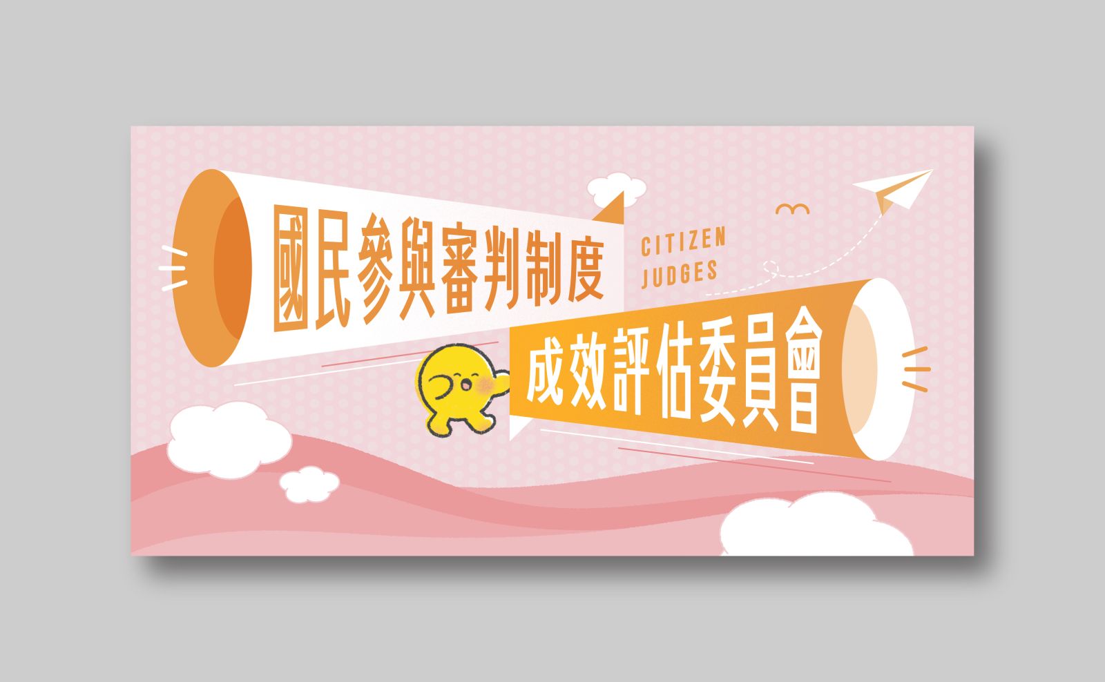 此設計將文案標題以小故事呈現。可愛的小黃人拿著巨大的大聲公通知大家國民參與審判制度的成效評估結果,右上角的紙飛機象徵訊息的傳遞,呼應大聲公相同的傳遞、通知功能。整體色調以柔和粉與溫暖橘呈現,打破既定主題較為嚴肅的意象。