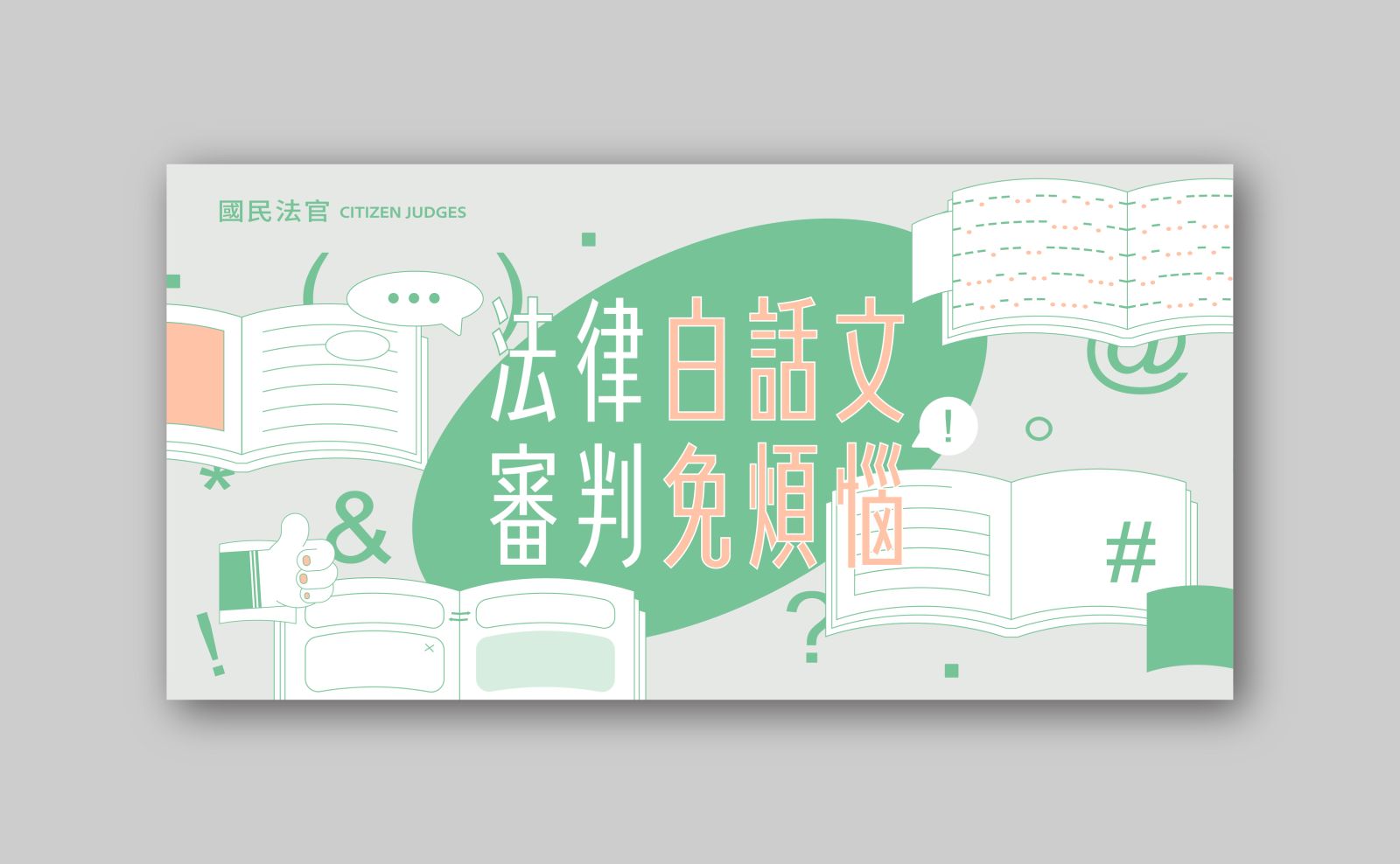 此設計將一本本翻開的法律相關書籍,加上以符號、摩斯密碼、翻譯等元素詮釋法典內的法律條文結合,表達透過國民法官的法律白話文運動,讓司法與人民的溝通對話更為容易。