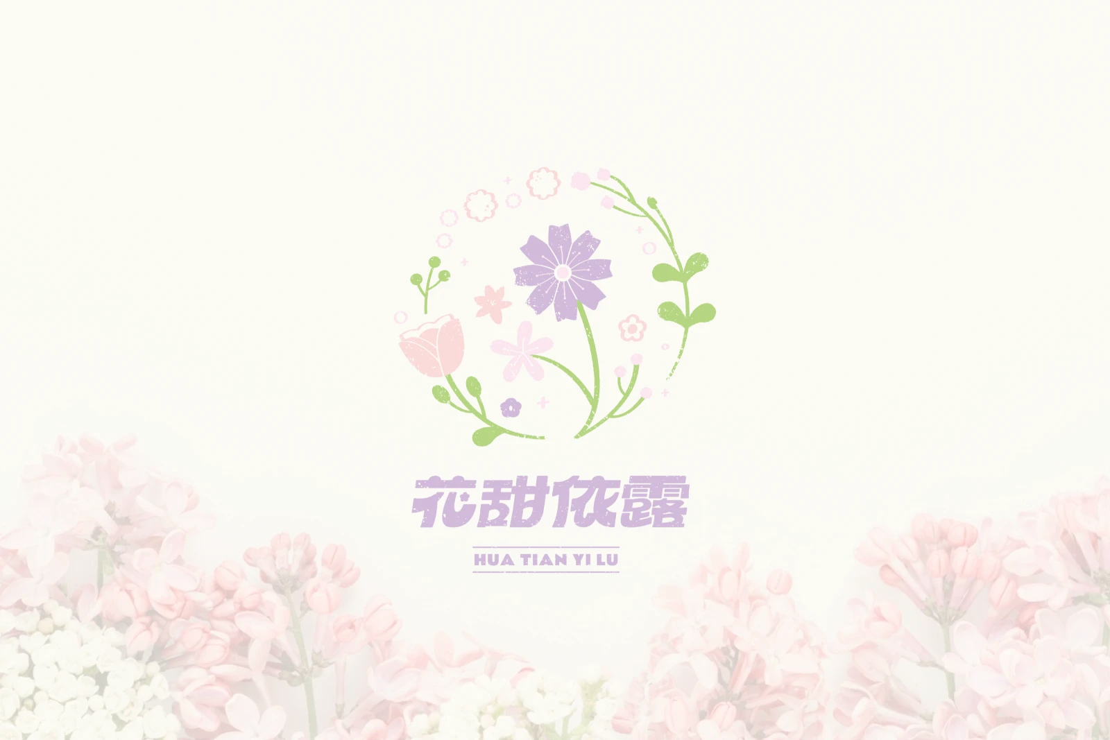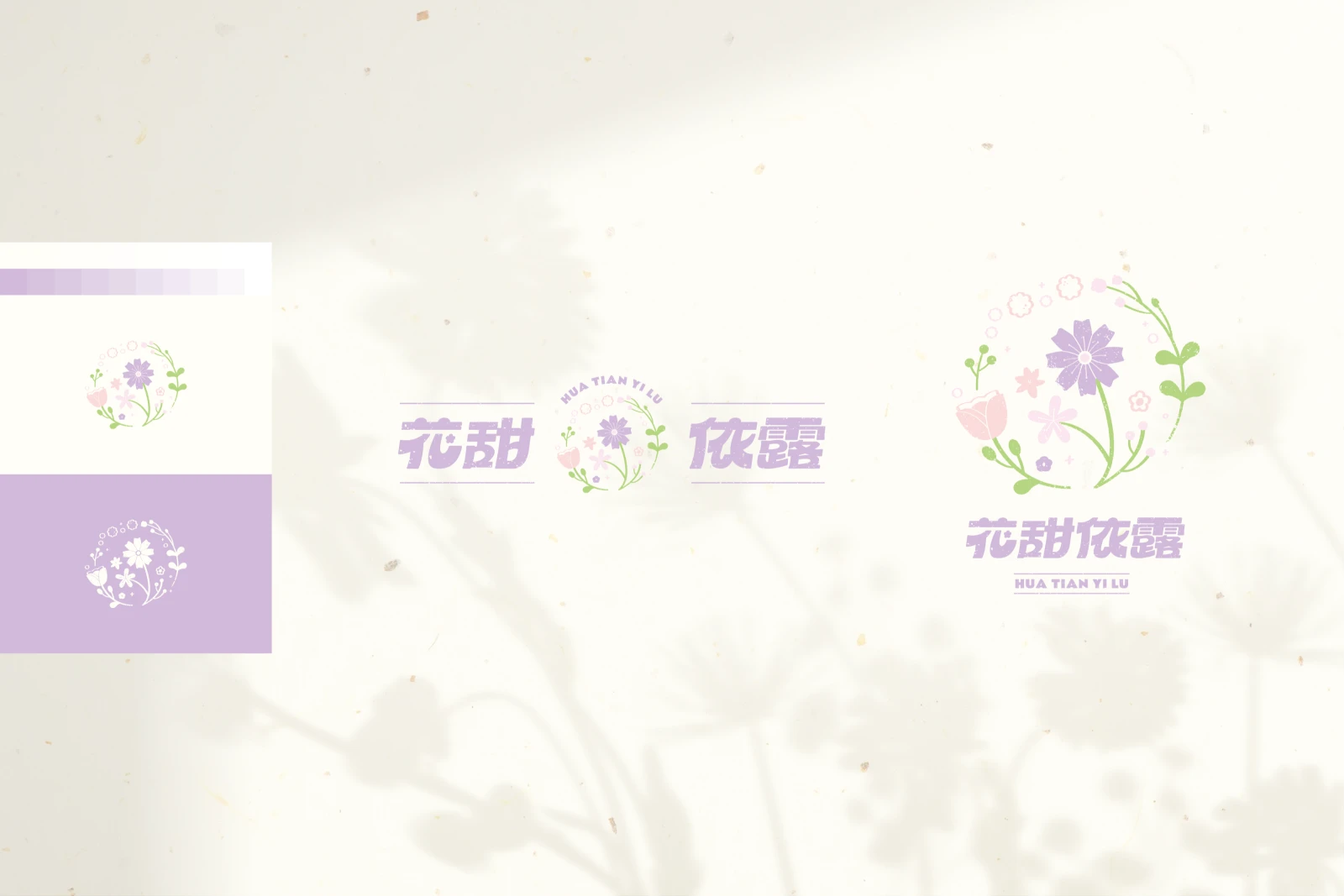 The logo design centers on hand-drawn floral illustrations, incorporating children's drawings of tulips and baby's breath to create a warm atmosphere. The standard font uses bold black type with full and lively strokes, showcasing a playful and cute style. The color palette features off-white and light pastel purple, presenting a soft and gentle visual impression.