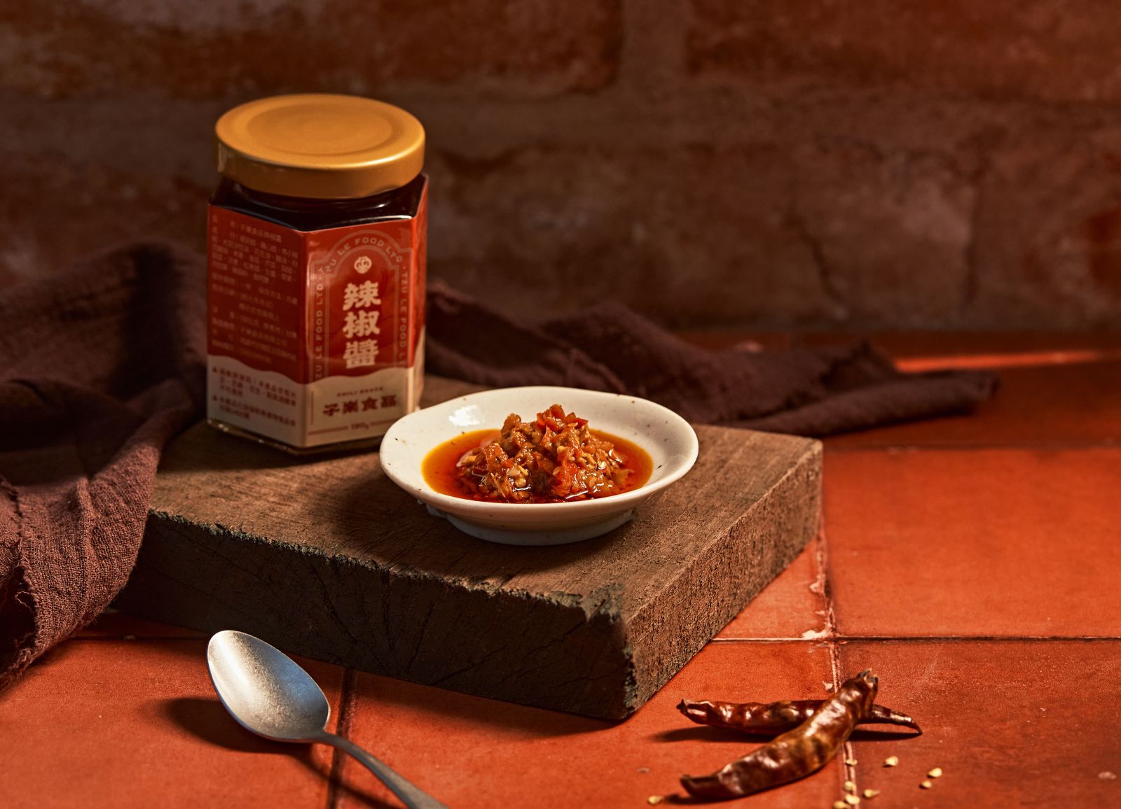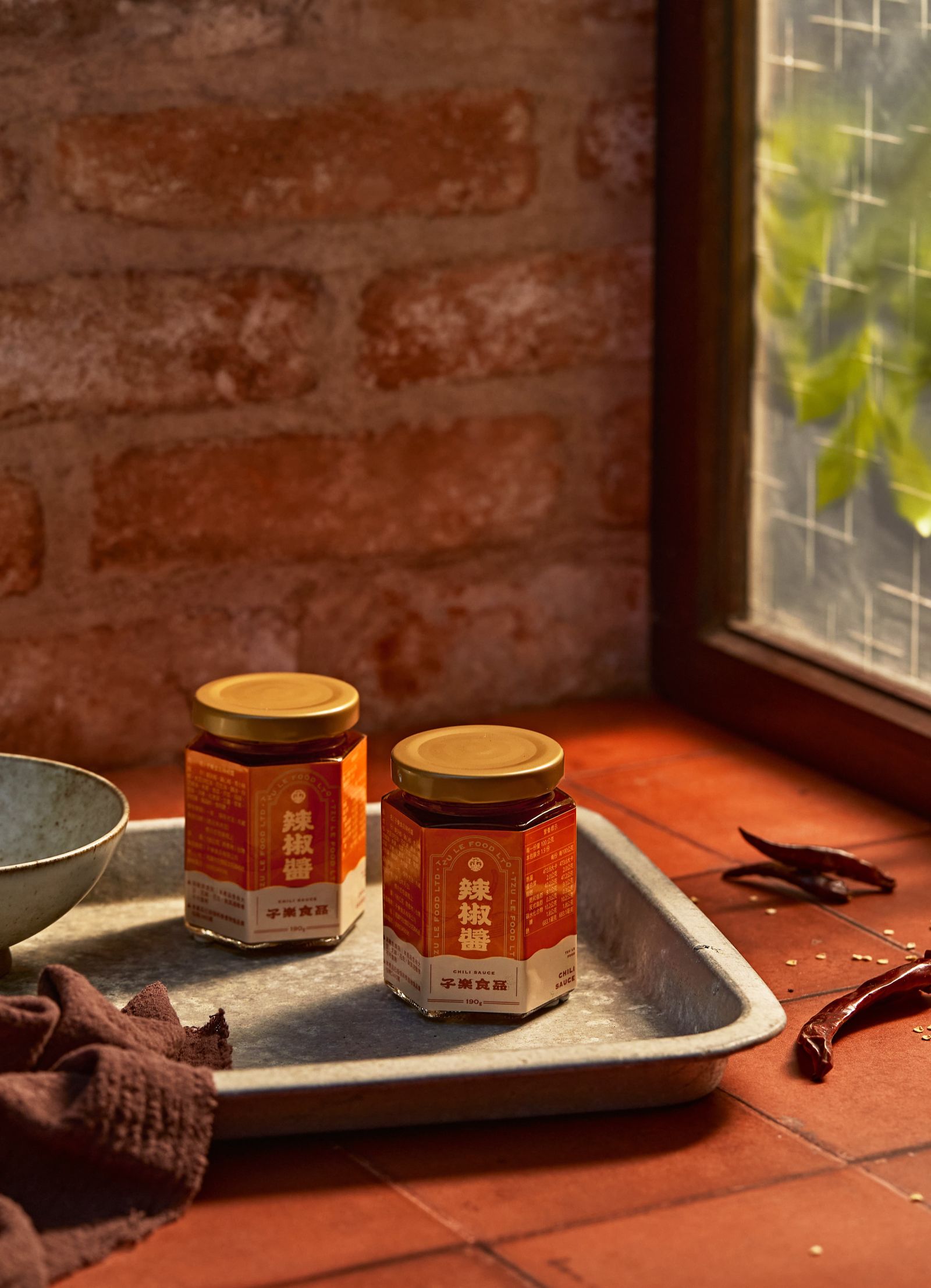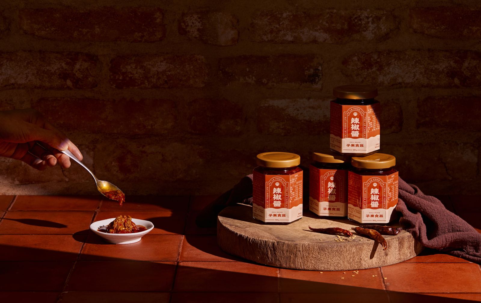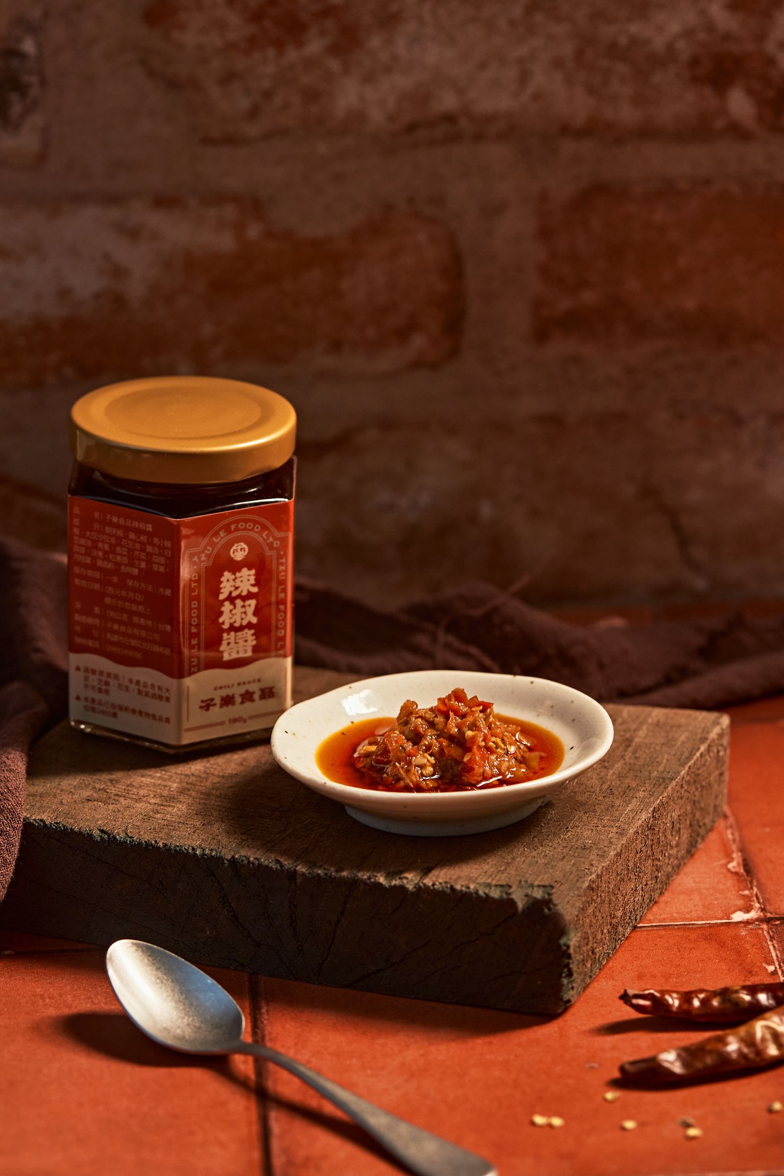 子樂辣椒醬瓶貼設計延續品牌既有 CIS 與名片視覺調性,以中式風格與辣椒插畫為核心,透過對稱構圖、框景式版面與品牌專屬標準字,形塑沉穩而具識別度的品牌形象。整體色彩以溫潤的紅為主軸,呼應辣椒的熱烈風味與中式飲食文化中的吉祥寓意,在傳統與現代之間取得平衡。細節上以雜點保留手感與細節層次,讓瓶貼不僅是產品標示,更成為承載品牌精神與風味深度的視覺延伸。