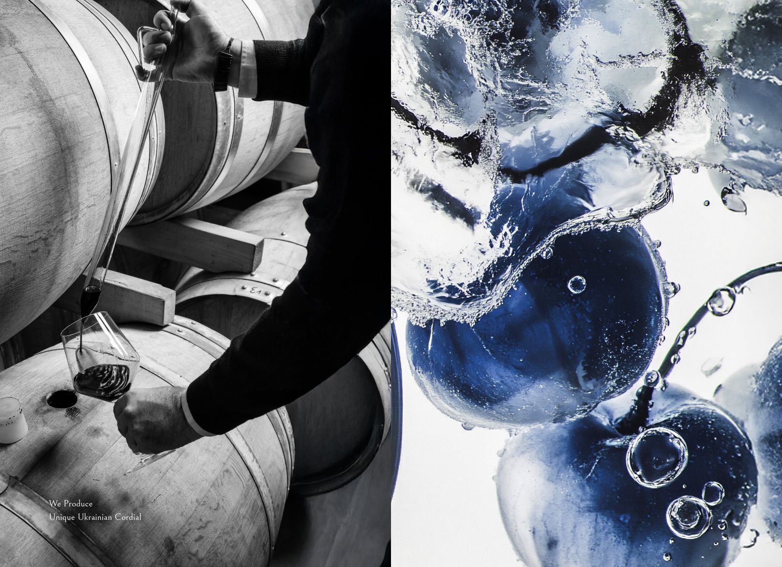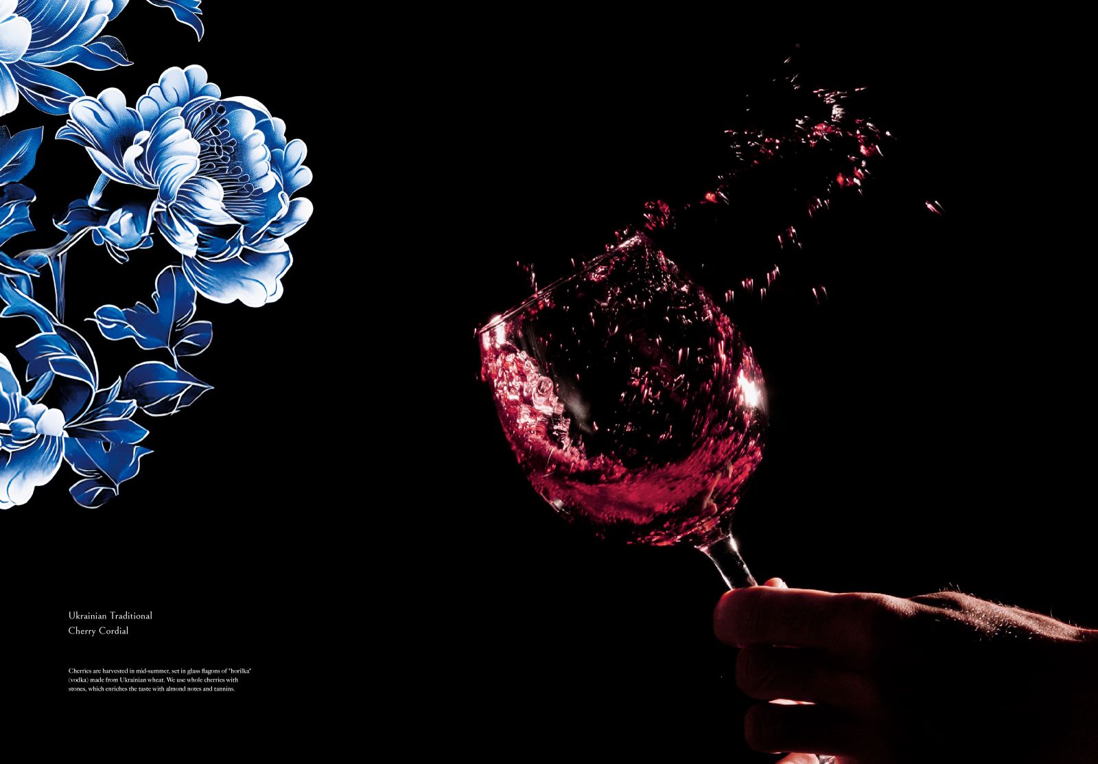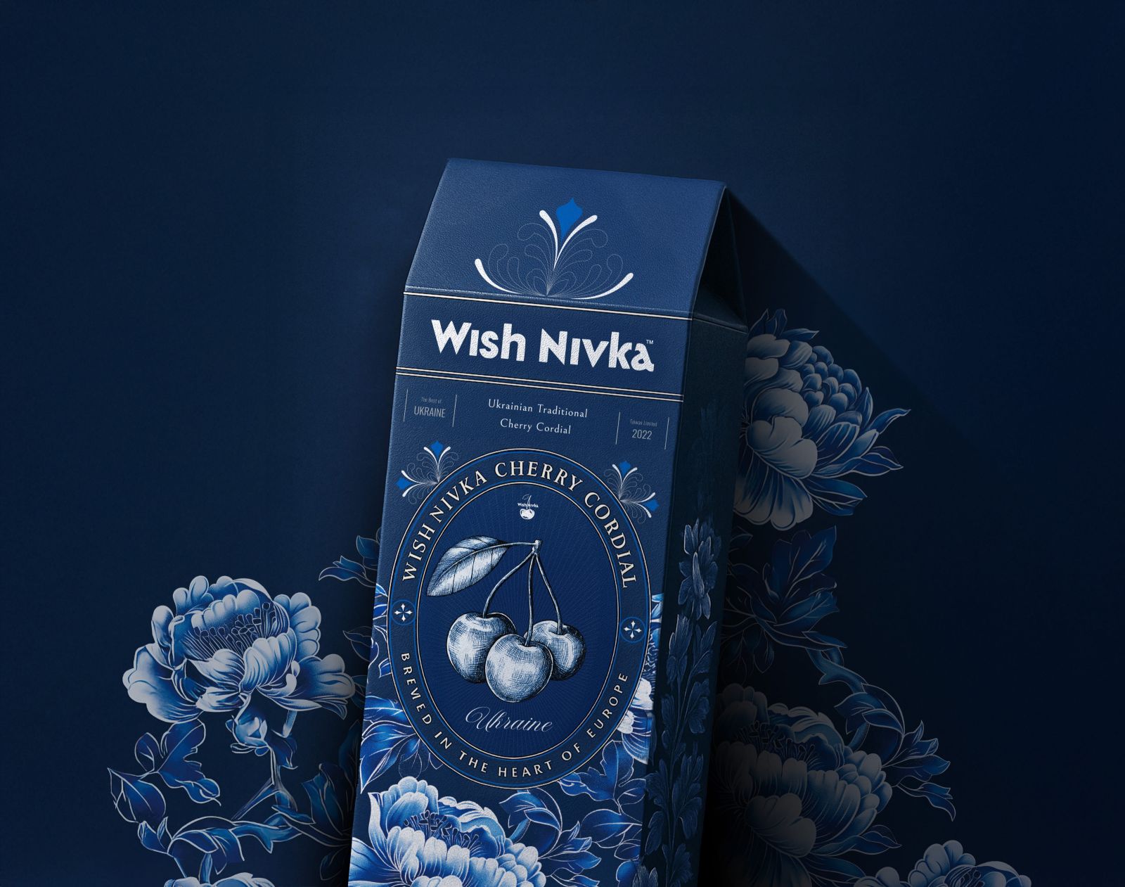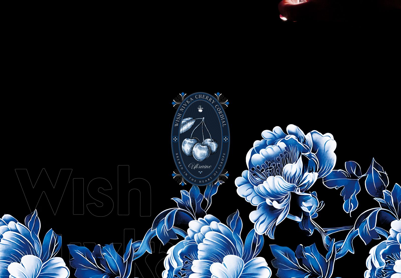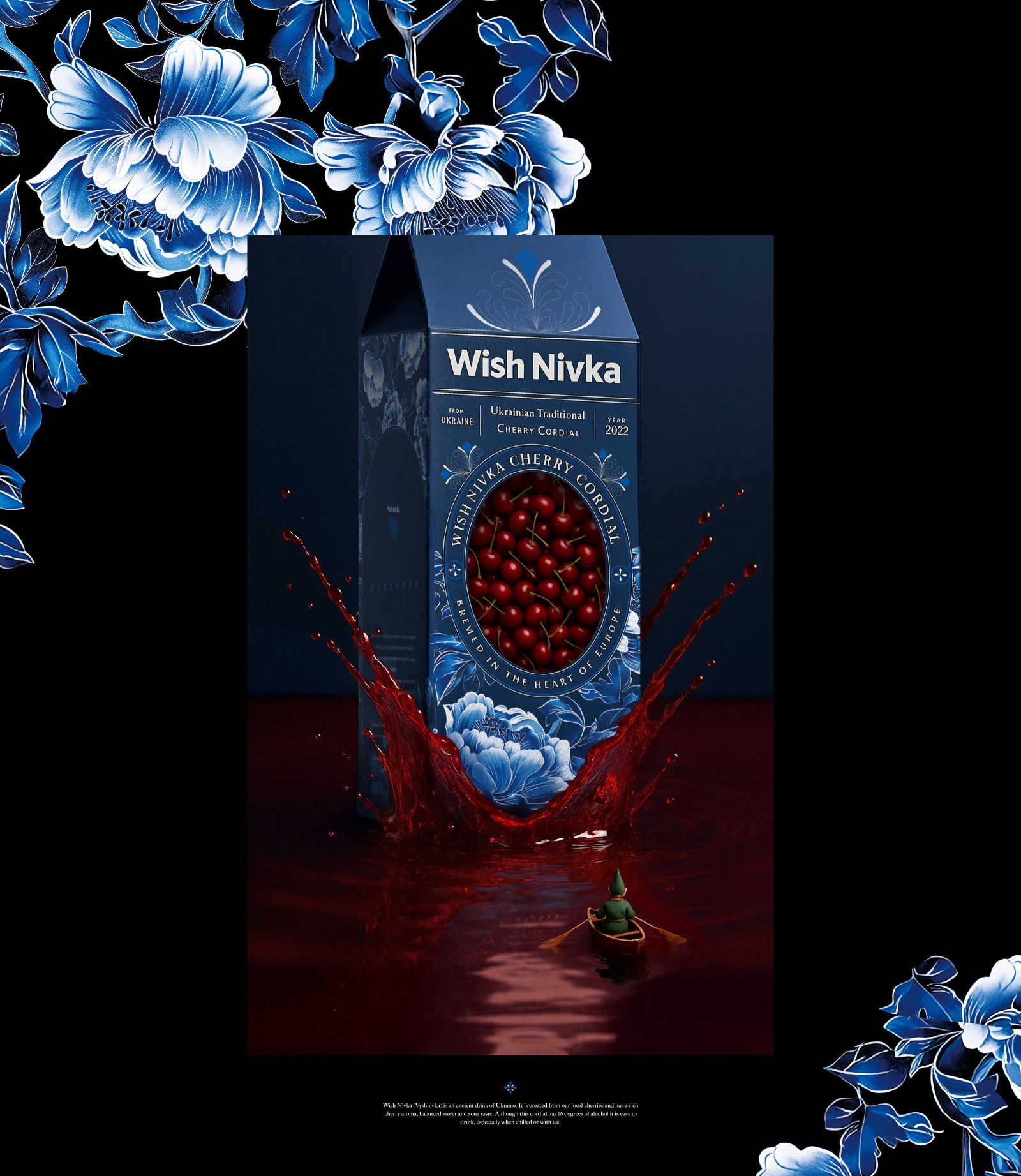 整體色調選用沉穩藍與雪白,呼應烏克蘭傳統花卉畫作,藉此強化文化傳承與高級質感。包裝背面視覺則以手繪櫻桃插畫結合現代字體,傳達出產品的天然原料與手工釀造精神。