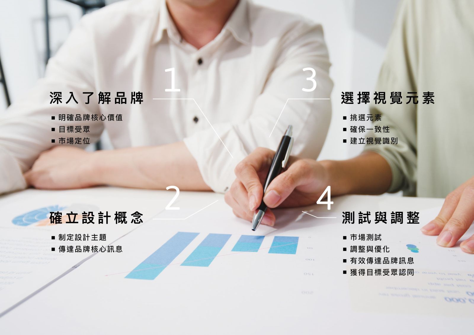 挑選能夠代表品牌的色彩、圖像、字體等元素,並確保其一致性,建立強烈的視覺識別。 - 測試與調整: