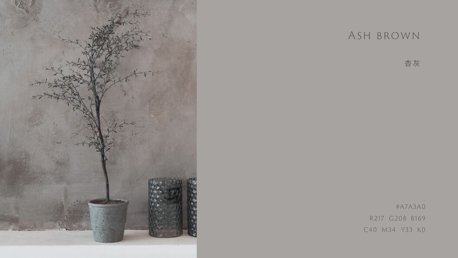 The primary color palette combines almond grey and misty brown—low-saturation beige tones that together evoke a soft, refined, and understated visual atmosphere.