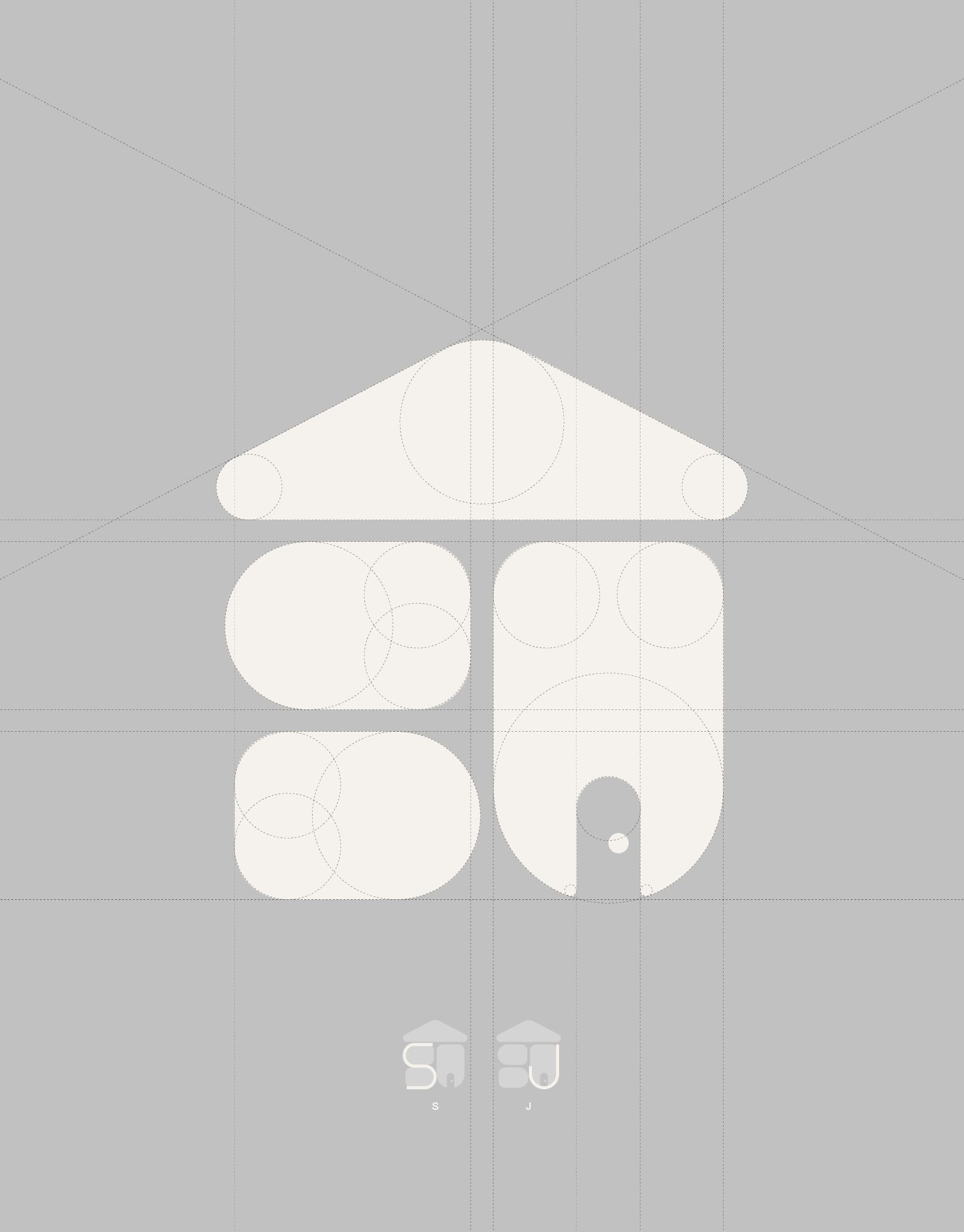 圖標整體以品牌英文名稱縮寫「SJ」結合房屋為設計主軸。將「S」與「J」簡化為幾何圓弧圖形,透過柔和的圓角設計呼應建築作品中常見的弧形元素,營造舒適溫潤的空間感。圖標上方以屋頂造型收束,完整形成「家」的意象,對應品牌理念「休息放鬆的所在,孩子成長的所在」。門口留白設計象徵「迎接」與「連結」,傳達室內設計不只是空間的改造,更是生活的入口與承載。標準色選用低彩度的奶油灰色系,營造高級溫暖的氛圍,傳達品牌「安心、舒適、家」的核心價值,整體呈現簡約、現代、質感的視覺調性。